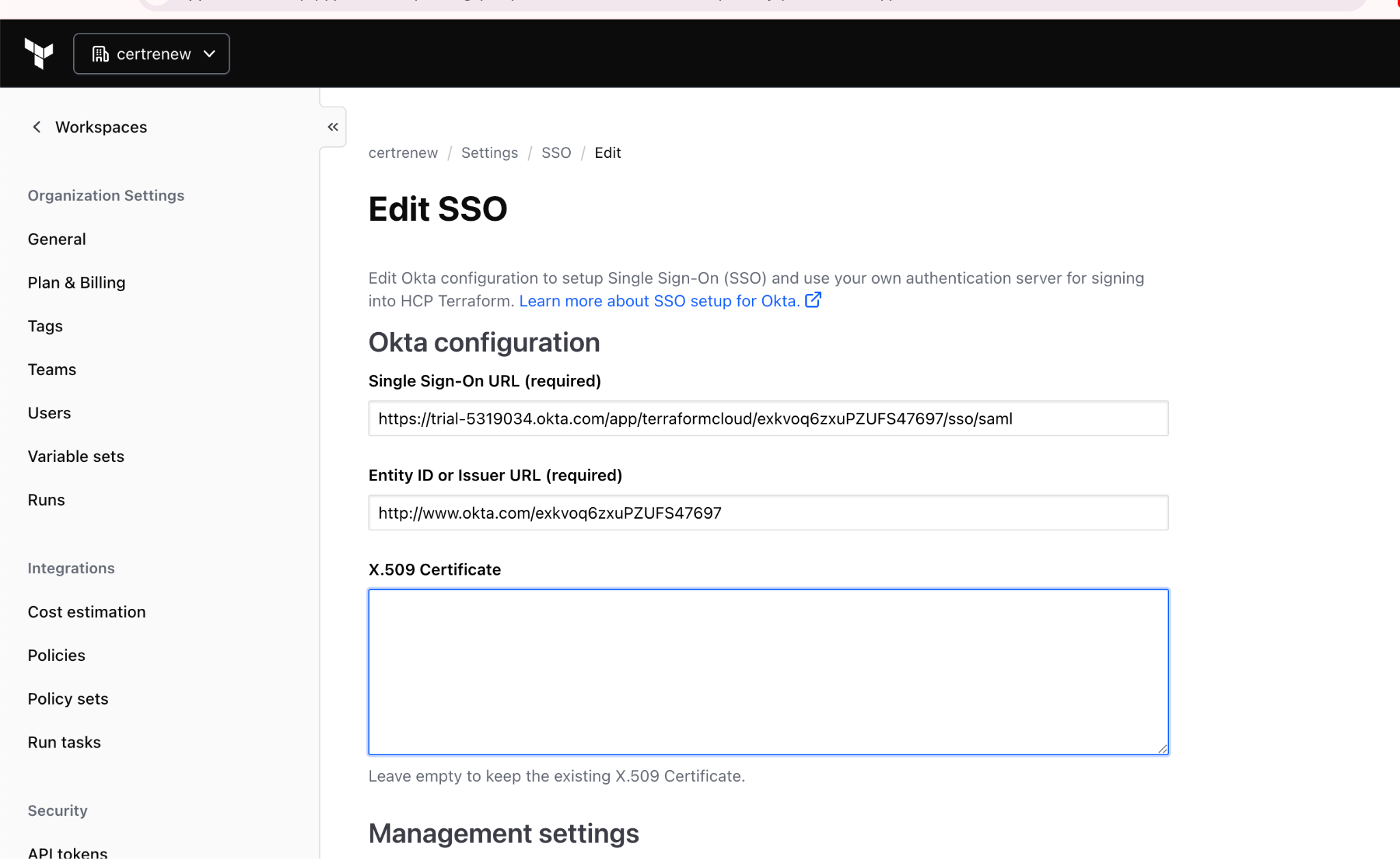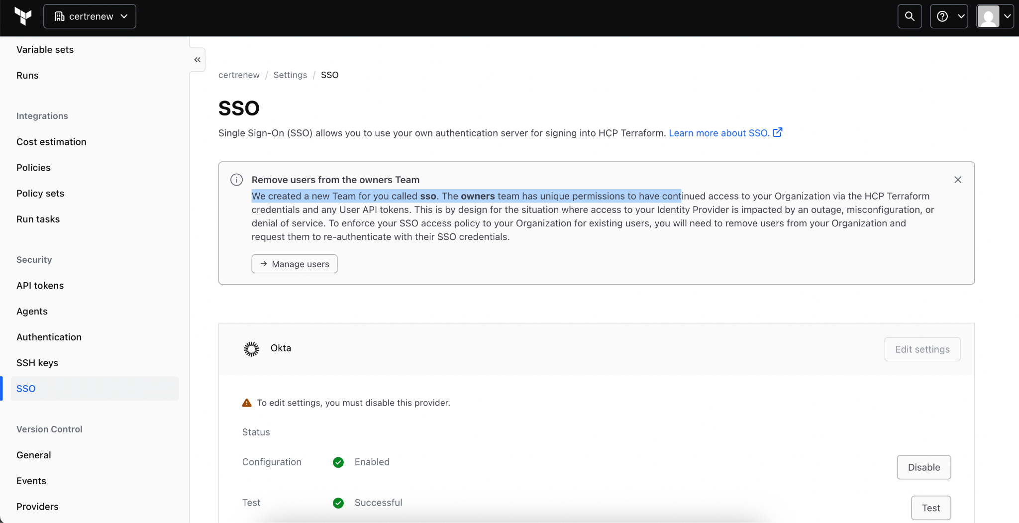 Since user management is handled through your IDP provider, and there are no changes to the existing user mappings, updating the certificate is a seamless process. Once SSO is re-enabled, all users assigned in your HCP Terraform SSO application will automatically regain access to HCP Terraform.