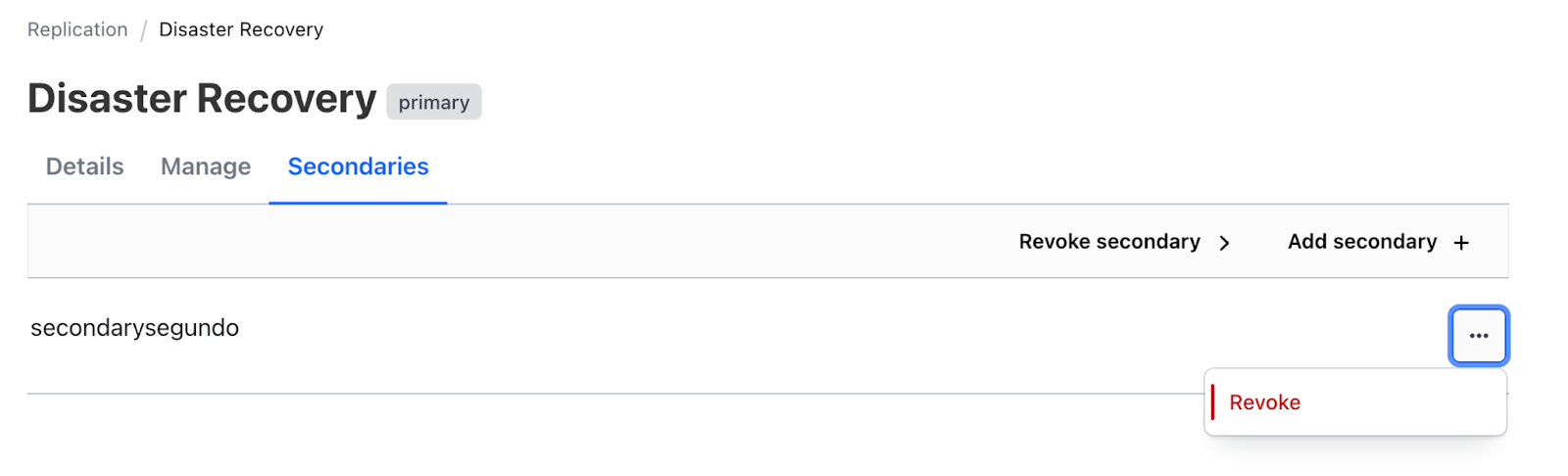Revoke the Secondary: Navigate to Monitoring -> Replication -> Disaster Recovery -> Secondaries. Click the three dots (...) next to the secondary cluster name, then select Revoke.