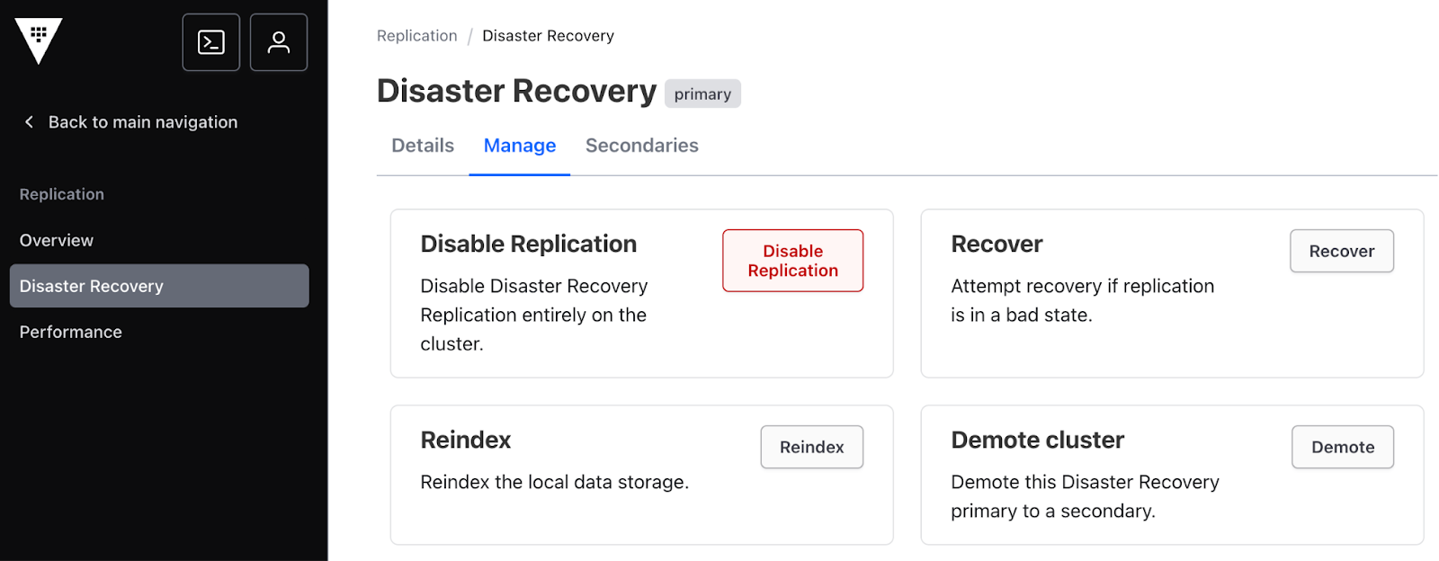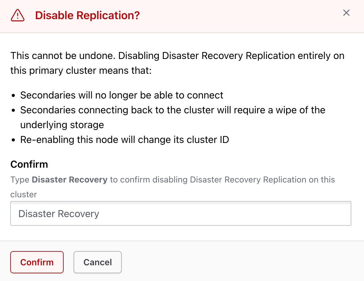 Disable DR Replication Mode: Navigate to Disaster Recovery -> Manage. Click Disable Replication and confirm by typing "Disaster Recovery" when prompted.
