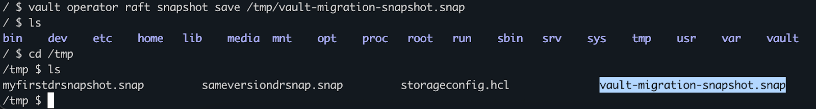 vault operator raft snapshot save /tmp/VAULT_MIGRATION_SNAPSHOT.snap