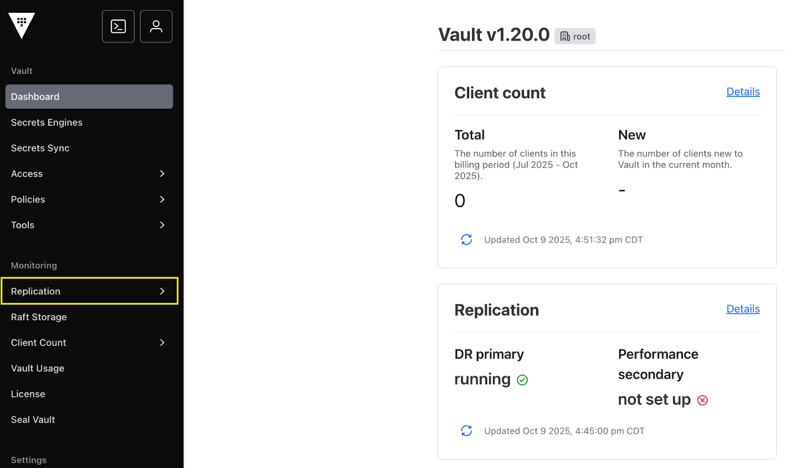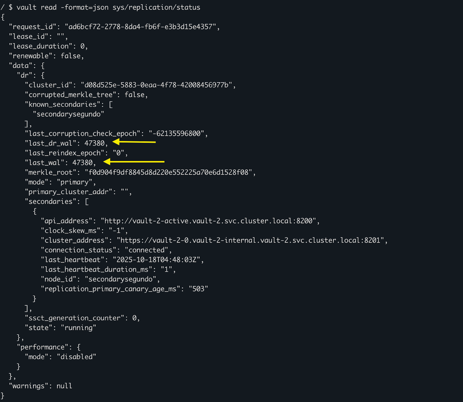vault read sys/replication/statusExpected Output (key fields):