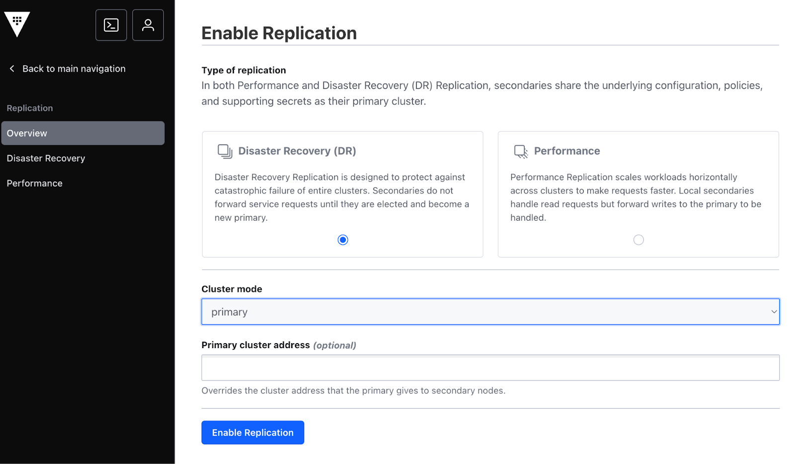 Note on DR Data Cleanup: Disabling DR replication does not automatically remove data from the secondary. Vault retains all replicated data in a read-only state. Manual cleanup must be performed if the secondary DR node is no longer needed.