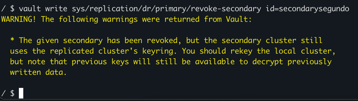 <SECONDARY_ID>obtained by inspecting the output ofvault read sys/replication/statusin Step 1. This cleanly breaks the DR link.vault write sys/replication/dr/primary/revoke-secondary id=<SECONDARY_ID> -