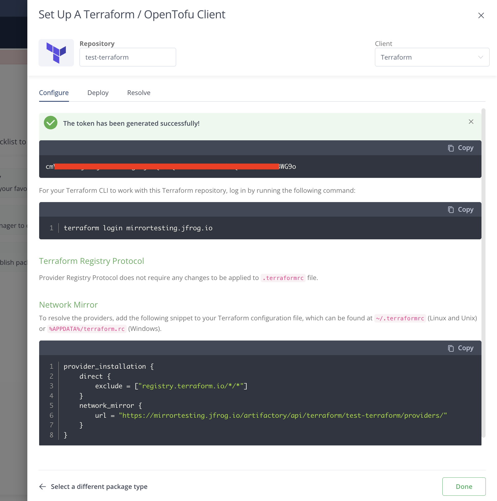 - In Artifactory, configure a repository that serves Terraform providers using the network mirror layout. Refer to JFrog documentation for creating a Terraform provider repository.
